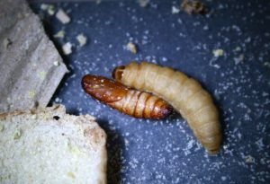 I T. molitor (a fianco) sono molto semplici da allevare e riprodurre, ma vanno anch’essi alimentati bene se vogliamo che costituiscano un buon pasto. Le larve misurano massimo 4cm.