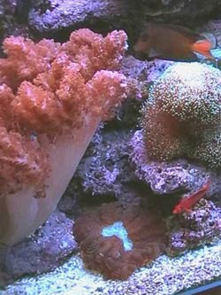 10.000 °K (accese per 6 ore) più due blu da 24 W ( Aquaspacelight dell’Aqualine Buschke) + 80 W di luce attinica (accesi per 12 ore) Marin-glo dell’Askoll.