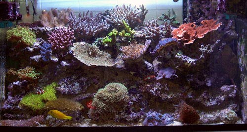 Dopo 10 gg. sia l’ammoniaca che i nitriti erano a zero, quindi ho iniziato a popolare l’acquario senza aspettare le consuete 8 settimane di avviamento. Ho inserito subito qualche molle: Actinodiscus, Sarcophyton, Parazoanthus, Clavularie e qualche pescetto. Dopo ancora un paio di settimane i primi LPS ed SPS, tutti gli altri coralli man mano che li acquistavo, fino al popolamento completo che è terminato a giugno 2002. Da allora ho inserito solo una piccola talea di Montipora Digitata gentile dono di un amico e due Lismata Grabhami reperiti a buon prezzo.