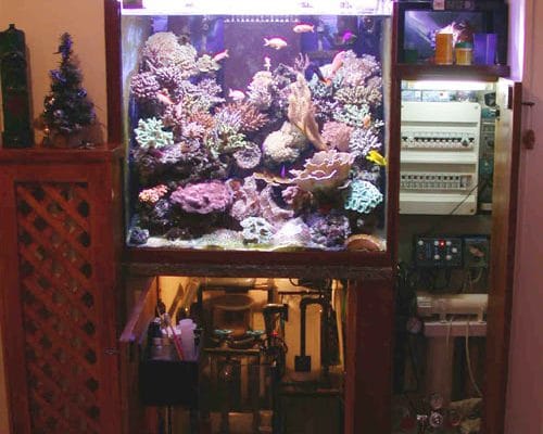 A fianco la vasca di rabbocco 20x55x35 con l’osmoregolatore che mi sono costruito. Sopra alla vasca di rabbocco il Reattore di calcio caricato con corallina jambo e il Kalkwasser mix che per esigenze di spazio ho dovuto costruire più piccoli di quelli che solitamente costruisco ma con le stesse caratteristiche. Nel vano accanto alla vasca il refrigeratore Resun, valido solo dopo qualche modifica, sotto, chiusa nel portello tutta l’apparecchiatura elettrica e i vari apparecchi elettronici per la misurazione del ph compreso il controller tunze.