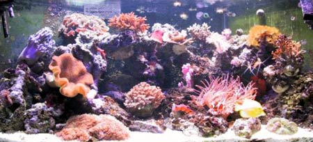 Un neon attinico Arcadia da 25W, un neon blu Marine Glo da 15W e due fari Fosnova Trial One Mastercolor con lampade HQI Aqualine Buscke 150W 10.000°K regolati da timer digitali in questo modo :