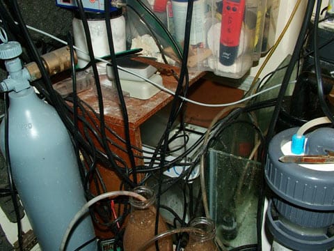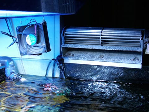 Il sistema di raffreddamento è molto….. tecnologico: dopo aver rischiato il divorzio per il refrigeratore che raffreddava l’acquario, ma scaldava il salotto, ho optato per una bella ventola tangenziale (grazie ik2vov) e ventoline da computer. Le ventoline si accendono insieme alle luci, mentre la ventola tangenziale si attiva quando la temperatura dell’acqua arriva a 26,9 ° centigradi. Il refrigeratore è finito in garage e al suo posto è arrivato il condizionatore per la sala: 🙂