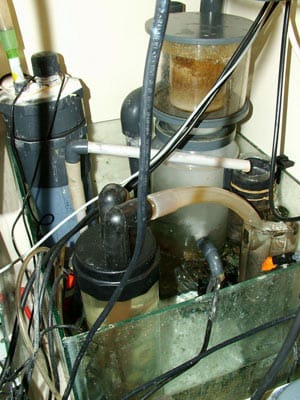 In sump trovano posto lo schiumatoio, il reattore di zeolite e un sacchetto di carbone attivo, un reattore di Kalkwasser autocostruito e inutilizzato da quando uso il sistema zeovit. Il reattore di calcio, (Knop C) è esterno.