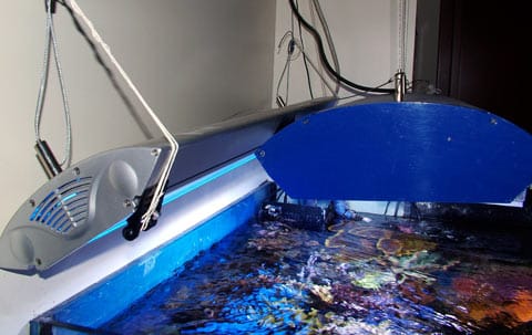 Attualmente uso una BLV da 10.000°K. Le luci blu sono accese dalle 15.30 alle 23.30, l’HQI si accende mezz’ora dopo e si spegne mezz’ora prima. Non utilizzo nessun sistema di simulazione alba tramonto, se si esclude una coppia di economici timer. La plafoniera HQI è sempre stata posizionata a circa 15 cm dalla superficie dell’acqua. Ultimamente, dopo la visita all’acquario di Girz a Norimberga, ho alzato la plafoniera a circa 30 centimetri, vedremo l’effetto che fa!