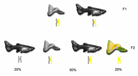 Nel caso dei guppy si potrebbero sostituire le caratteristiche con, ad esempio, la colorazione del corpo e la forma della coda ottenendo combinazioni con le stesse proporzioni tra caratteristiche dominanti e recessive.