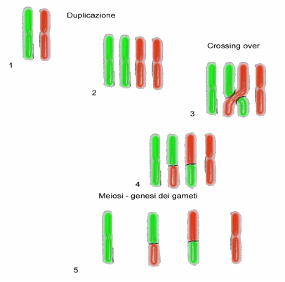 subito dopo lo sdoppiamento dei cromosomi durante la Mitosi (2); prima che la cellula si divida in due identiche, cromosomi omologhi in particolari condizioni possono sovrapporsi accavallandosi (3). In questa situazione i legami dei filamenti di DNA si spezzano e come conseguenza i cromosomi si scambiano parte delle informazioni. Il risultato di questo processo è la formazione di due cromosomi nuovi e unici e che contengono combinazioni di informazioni diverse da quelle di partenza (4).