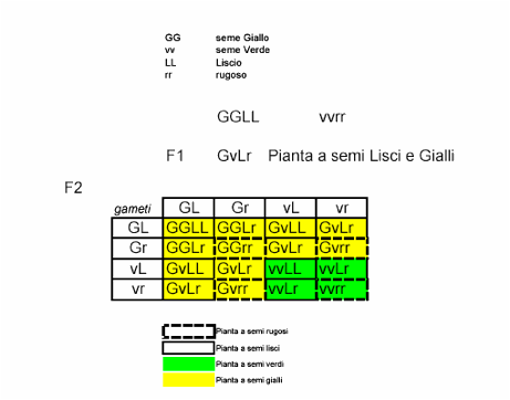 Incrociando una pianta a semi gialli e lisci con una a semi verdi e rugosi ha ottenuto, secondo la prima legge, una F1 di piante a semi gialli e lisci (caratteri dominanti) ma nella seconda generazione F2 i risultati sono stati :