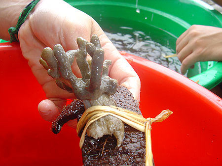Per il fissaggio vengono usate fibre vegetali, che si decomporranno naturalmente dando al corallo molle il tempo di fissarsi al nuovo substrato.