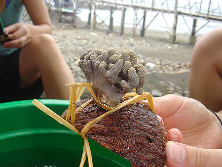 Il materiale scelto per il fissaggio è il guscio delle noci di cocco: Un materiale leggero, che resiste molto bene all’immersione in acqua di mare, ampiamente disponibile nell’area.