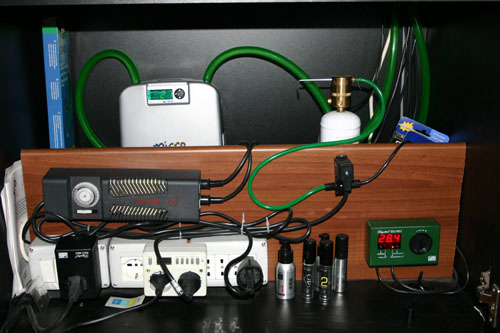 In primo piano, il sistema, autocostruito, dei cablaggi. Sono tre blocchi di prese fissati ad una tavola di legno sostenuta da due staffe ad “L”.  Si nota lo starter di due neon con timer incorporato. L’altro starter e’ posto sul retro ed è privo di timer. Sulla sinistra vi è il trasformatore dell’elettrovalvola e il timer elettronico. Sulla destra in alto l’elettrovalvola per la somministrazione di CO2 attualmente comandata da un timer.