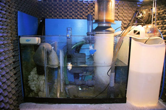 La sump: Una vasca artigianale di 60lt divisa in tre scomparti mi permette di alloggiare i componenti di filtraggio e una decina di kg di rocce vive, lo schiumatoio è un LGs 600 sp tarato al massimo delle sue potenzialità e con una schiumata secca o bagnata a seconda delle necessità