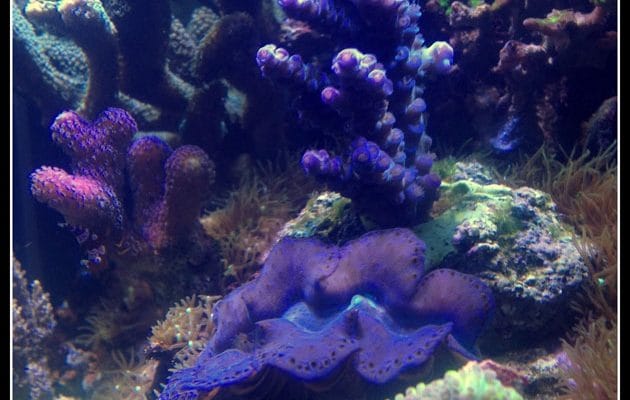 L’elenco dei coralli presenti è in continua crescita, perché nonostante sembri ormai un acquario pieno zeppo di coralli un piccolo anfratto dove aggiungere qualcosa lo si trova sempre. Il layout della vasca è stato pensato e si è evoluto per ospitare qualsiasi tipologia di coralli, partendo nella parte bassa dove vengono ospitati i coralli molli, tra i quali Actinodiscus vari, Ricordee e colonie di Zoanthus che invadono la parte bassa dell’acquario e sono diventati una vera e propria mania; nella parte centrale dedicata agli lps sono presenti diversi tipi di Euphyllie parancora e paradivisa, plerogyra, calici di Caulastrea e piccoli frag di Acanthastrea Lordhowensis ed Echinata di svariati coloro; inoltre fa capolino una splendida tridacna. Nella parte più alta della vasca dedicata esclusivamente agli SPS sono presenti in un angolo a loro quattro diverse Montipore Foliose dall’arancio al verde passando per il rosso e il viola; Acropore spp varie oltre che Microphthalma, Loisettae e Tenuis. Inoltre sono presenti montipore digitate azzurre e rosse in continua taleazione per via della crescita e una Malampaya. L’acquario ospita anche un esemplare di Gorgonia Menella, presa ben consci che essendo azoxantellata, l’alimentazione è importante per farla vivere al meglio.
