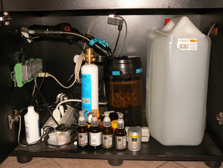 Sistema di filtraggio Per Il filtraggio biologico, meccanico e il movimento dell’ acqua in vasca utilizzo un filtro esterno Prime 200 della Hydor al quale ho abbinato il termoriscaldatore esterno ETH 200 sempre della Hydor. I tubi di mandata e aspirazione, sostituiti con alrti in plastica trasparente, uscendo dal mobile passano sul lato corto sinistro. Per migliorare l’ aspetto estetico ho sostituito gli accessori originali del filtro con i bellissimi accessori in vetro soffiato della ADA: Lily Pipe Inflow e Lily Pipe Outflow.