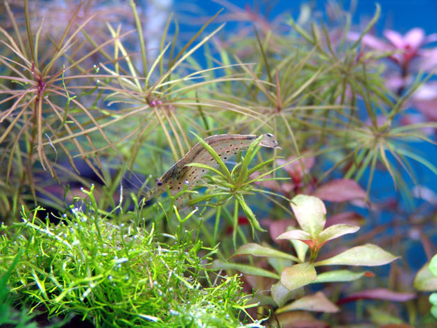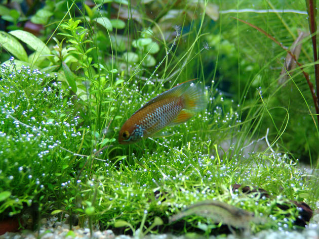 Ora sono presenti in vasca 7 nannacara , di cui una femmina e due maschi adulti e 4 piccoli (2 maschi + 2 femmine): decisamente troppi per una vasca così piccola,lo so, ma finché la convivenza è possibile mi godo lo spettacolo che il comportamento di questi piccoli animali offre con i veloci mutamenti di colore a secondo dell’umore e delle circostanze. Assolutamente messi sotto disciplina dalla femmina adulta sono cinque “cardinali” che hanno già diversi anni. Per ultimo,10 caridine compongono un’efficientissima squadra di mangiatrici di alghe.