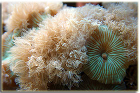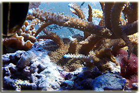 I Problemi avuti: E’ normale avere dei problemi quando si gestisce una vasca di questo tipo. Da una parte le mie fatiche più grandi sono state quelle di dover combattere contro coralli molli che si sono rivelati infestanti, e che quindi mi hanno creato, e mi creano, non pochi problemi nella gestione dei coralli duri. In particolare i discosomi si sono riprodotti in tutti i punti dell’acquario, anche in verticale, impegnandomi in una strenua lotta nell’evitare i contatti fra questi e gli sps. Di altra natura il problema avuto da parte della Xenia, che pur non essendo tossica in senso lato, tende a ricoprire qualsiasi cosa in acquario, arrivando quindi a soffocarla. Ma questi sono problemi dovuti ad una cattiva gestione della convivenza fra coralli duri e molli, i veri problemi avuti ritengo siano essenzialmente due. Il primo, di semplice soluzione una volta compreso, è stata una invasione incontrollata di alghe rosse incrostanti, dovute ad un livello di silicati nell’acqua molto oltre l’accettabile. Una volta capito il problema, ed intervenuto con un filtro post-osmosi contro i silicati, è stato incredibile l’osservare la sparizione totale di tutte le alghe in meno di 10 giorni. Il secondo problema invece è probabilmente un problema di difficile soluzione. Sono stato invaso da una specie di idrozoi, i Myrionema amboinensis, che a prima vista sono carini, ma che infestano completamente l’acquario, e tendono a soffocare qualsiasi cosa. Non hanno praticamente nessun nemico naturale, che non sia anche un nemico di coralli, tranne i ricci, ed in special modo i Salmacis bicolor ed i diadema setosus, ma che sono estremamente lenti nel cibarsene. Riporto qua due foto prese dagli esemplari della mia vasca. Nel forum, a questo indirizzo, http://acquariofilia.biz/viewtopic.php?t=1981 se ne è parlato a lungo senza trovare pressochè nessun rimedio definitivo, ma è una discussione sempre aperta che potrebbe prima o poi rivelare un nuovo rimedio. L’alternativa è quella di rimuoverli meccanicamente quando formano un gruppo folto, in modo che ne sia facilitata la loro rimozione, aiutandosi con una pinza a becco lungo, solo che sono talmente piccoli e fragili che ricresceranno senza dubbio alcuno. Conclusioni: Quando penso alla mia vasca mi viene da pensare alla caparbietà con cui sono riuscito ad arrivare ad una vasca di SPS pur partendo da una vasca gestita con il biologico, con attrezzature sbagliate e con un tappeto di coralli molli in vasca. Nonostante una attrezzatura tecnica sbagliata, nonostante coralli molli infestanti in ogni angolo della vasca, sono riuscito ad avere la vasca che ho sempre desiderato. Tanti coralli duri e soprattutto molto molto grandi ed estesi, che è sempre stato un mio obiettivo.