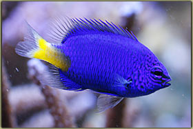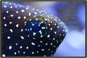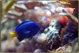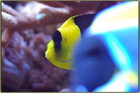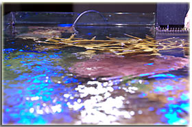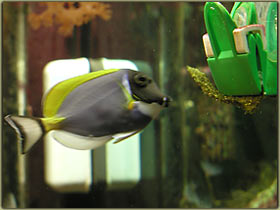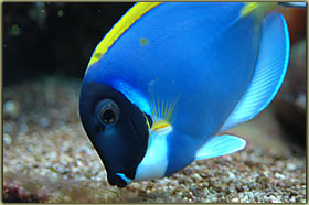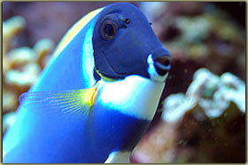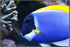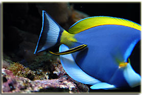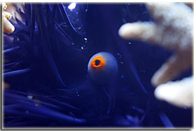 Nelle foto riportare sotto è possibile vedere la femmina nell’atto della deposizione ed uno scatto alle uova. Chrisiptera parasema: ultimo rimasto di una terna inserita all’allestimento dell’acquario, condivide con l’altro pagliaccio la longevità di 5 anni. Pesce territoriale, ma soprattutto verso i suoi simili, tanto che all’inizio le 3 chrisiptere si erano divise l’acquario in parti uguali, un terzo a testa. Non so se oggi riuscirei a fare a meno di quel bellissimo blu acceso; Acanthurus leucosternon: il vero padrone dell’acquario, acquistato piccolo ormai è vicino ai 18 cm di lunghezza, è con me dal luglio del 2002, quindi sulla soglia dei 5 anni. Purtroppo l’acquario attuale è un po’ stretto per un pesce di queste dimensioni, come non mi dimentico mai di dire nel forum, e quindi con l’età tende a diventare aggressivo, soprattutto verso lo zebrasoma. In famiglia lo abbiamo chiamato affettuosamente Berto, è talmente docile che si fa pure accarezzare la schiena senza timori. Oggi però non lo ricomprerei proprio perchè il mio acquario è troppo piccolo per ospitarlo in modo degno, e quindi manifesta il suo disappunto con una aggressività più alta del normale.