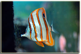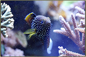 In merito mi piace molto darle da mangiare le cozze vive, dato che riesce a mangiarne fino a 4 consecutivamente risucchiandole dal guscio aperto, oggigiorno la sua dieta è composta quasi completamente da cibo granulare ma i primi due anni non è stato semplice darle da mangiare mysis liofilizzati ed altro, visto che il secco non lo guardava; Centropyge bicolor: ormai in taglia adulta, anche lui bello grassoccio, fa parte della triade di inserimenti del luglio del 2002, preso perchè il loriculus che avrei voluto prendere non arrivava, oggi sono assolutamente contento della scelta. Il suo tipo di nuoto flessuoso, il suo continuo andirivieni dentro e fuori la rocciata, sono caratteristiche peculiari fondamentali di questo bellissimo pesce.