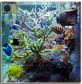 E’ quasi ora del pasto, come si vede dall’assembramento di quasi tutti i pesci al di sotto dell’anellino posizionacibo, nella penombra si intravede anche la Calloplesiops e l’Acreichthys, in alto sopra la stream si vedono alcune Aiptasie, e sempre sulla sinistra diverse chiazze inestirpabili di Myrionema. Si notino anche, ed è impossibile non notarle, le incrostazioni di alghe calcaree e la dimensione relativa dei coralli… e la tridacna che prospera nell’ombra. La A. nobilis è appoggiata al vetro e questo rende difficile la sua pulizia.Tutto il mio acquario in una foto… |