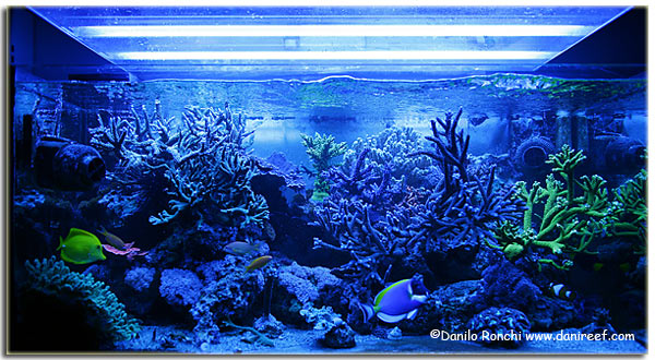 Come accennavo sopra la luce è l’altra caratteristica che nel tempo è mutata maggiormente. Partito con una 2x54pll, sono passato ad una 4x54pll, poi la conoscenza del forum mi ha portato nel mondo delle HQi, prima una CEAB Sunsky da 2x150w con reattori elettronici, luce lunare e 2 pll da 54w blu, con la quale il mio acquario ha cominciato a vivere e prosperare, poi una Costaplafoniere 2x250w con 2t5 da 54w, con la quale il mio acquario è letteralmente esploso.