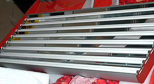 Il fotoperiodo è suddiviso in 11 ore di blu e 9 e mezza per le altre 6 lampade. Attualmente uso 6 tubi ATI aquablue spezial e due ATI blu plus.  | La Plafoniera ATI Powermodul appena arrivata ed adagiata sul letto per vivisezionarla prima del montaggio sulla vasca |