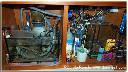 Faccio un piccolo passo indietro, che è anche una premessa. Il mio acquario si regge oggi sul più classico Metodo Berlinese, seguito quasi alla lettera, senza nessuna aggiunta di alcun tipo. Il passaggio dal biologico al berlinese è stato lungo e non privo di problemi e prove. Insieme all’illuminazione il sistema di filtraggio è stato quello che hacambiato maggiormente nella vita del mio acquario. Come detto il sistema era iniziato sotto l’egida del biologico e solo la frequentazione del forum di acquaportal, del newsgroup it.hobby.acquari mi ha convinto a passare ad un sistema di conduzione berlinese. Per farla breve ordinai un Aquamedic Turboflotor 1000 multi sl per il grande salto, che usai per oltre un anno, poi passai ad un Deltec MCE600, dei quali potete leggere una mia prova comparativa cliccando qua, fino a quando sono riuscito a costruirmi la sump e quindi ho ordinato un H&S 150F2001. Uno skimmer monompompa con il diametro della camera di contatto di 15cm spinto da una pompa Aquabee 2001 con girante a spazzola. L’uso dello schiumatoio associato alle rocce vive mi consente di tenere i nutrienti a valori non rilevabili con i normali test colorimetrici, in genere uso test Salifert.  | Qua a fianco si vede l’organizzazione del mobile. Nella parte sinistra la sump con schiumatoio, caduta e risalita, riscaldatore e sonde, a destra invece reattore di calcio, trasformatori delle Tunze Stream, vasca di rabbocco, multicontroller Tunze, e unità di potenza Aquatronica. |