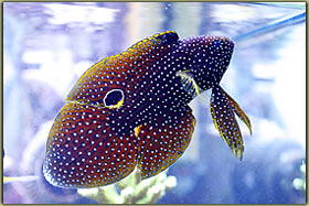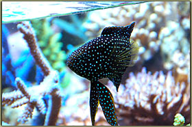 La prima foto è tutto fuorchè bella, ma è una delle più vecchie che ho, risale all’agosto del 2002, e sicuramente testimonia come questo magnifico pesce sia cresciuto, da notare infatti il rapporto fra la testa e le pinne… e come allora si vedesse la linea laterale… dato che oggi, come dice chi viene a vedere il mio acquario, è difficile vederne uno che stia meglio in cattività se si misura la larghezza del dorso Calloplesiops altivelis: la nostra Camomilla, pesce spaventosamente bello, anch’ella in vasca dal luglio del 2002 ed ormai in taglia adulta di 20 cm, ha una sola controindicazione, il suo innato appetito verso i gamberetti, anni fa quando ancora la mia cultura acquariofila era molto bassa in tal senso, si è pappata ben 7 lysmata wurdemanni nel giro di due sere. A parte questo ed una timidezza sicuramente accentuata rispetto ad altri pesci, è un pesce che si lascia ammirare in tutta la sua bellezza soprattutto al crepuscolo o quando sente odore di cibo.