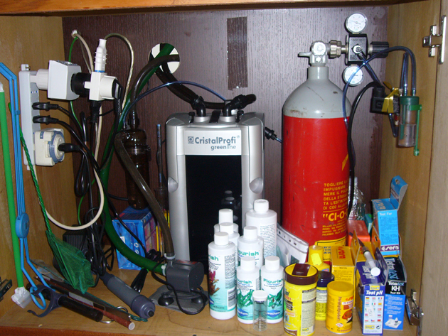 Insomma l’attrazione per il mondo vivente e per la natura che ci circonda fa parte della mia vita da sempre ed il conseguimento della laurea in Scienze Biologiche non può che esserne la prova provata. Adesso ho 44 anni ma purtroppo il mio lavoro e tutt’altra cosa. • L’idea e l’attrezzatura Mia idea e prerogativa inscindibile nel creare il mio acquario, assolutamente di tipo aperto, è che dovevo costruirmelo da me integrandolo quando più possibile con l’arredo della casa. Pertanto il mobile è stato costruito dal sottoscritto fino all’ultima vite, vernice compresa (verniciato a tecnica mista con gomma lacca e cera). Stessa cosa per l’assemblaggio dei vetri fatto con del normalissimo silicone nero (un acquario precedente costruito a casa dei miei, è stato svuotato dopo 20 anni ed il silicone non mostrava nessun segno di cedimento!) usando dei cristalli comprati in vetreria dello spessore di 1 cm.