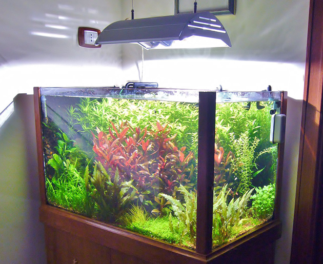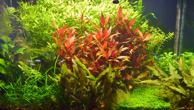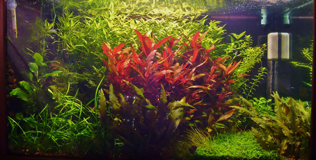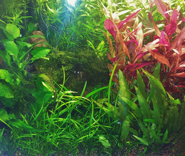 Nella gestione dell’acquario uso acqua di rubinetto (nella mia zona non è calcarea) seguendo per intero il protocollo “base” Seachem che prevede un cambio del 5% di acqua settimanale con aggiunta dei fertilizzanti a giorni alterni. Uso la linea Flourish e non penso di passare alla nuova linea Aquavitro. La CO2 è tarata sulle 80 bolle al minuto che mi permettono di avere un pH stabile sulla neutralità. Non sono un fissato delle misurazioni ma faccio le essenziali, ora, saltuariamente: pH, Kh, No3 e PO4. Quest’ultimi due li trovo sempre a zero. Ecco perché in mezzo alla settimana aggiungo 2ml di Phosphorus e 2ml di Nitrogen. Due volte al giorno somministro del mangime granulare ai pesci alternandolo all’Artemia salina liofilizzata.