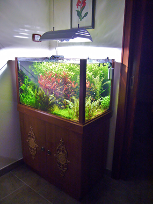 Le misure sono lunghezza 85cm, profondità 45cm, altezza 50cm. Il volume netto dovrebbe aggirarsi sui 160 litri. Siamo venuti ad abitare nell’attuale abitazione nel 2005 e quell’angolo di casa era sin dall’inizio destinato all’acquario…che è arrivato qualche anno dopo. La pazienza è la virtù dei forti! Detto questo ho iniziato ad acquistare i vari accessori con calma, man mano che mi si presentava l’occasione, anche per fare un buon affare, spesso acquistando di seconda mano. Cronologicamente, ho iniziato con il cavetto riscaldante sotto sabbia Dennerle a bassa tensione (24 volt), seguito poi dal riduttore di pressione sempre Dennerle a due manometri. Intanto un amico mi procurava due estintori a CO2 da 3Kg. È stata poi la volta della plafoniera, rigorosamente con lampada ad alogenuri metallici, filtro esterno della JBL “Cristal Profi E 901” e diffusore di CO2 anch’esso rigorosamente esterno della Sera “Reactor 500”, elettrovalvola CO2 della Ruwa. Infine ho acquistato una pompa esterna per poter far lavorare il reattore della Sera, trattasi di una Maxi Jet 1000. • Fondo e protocollo di concimazione Penso che la decisione sul fondo da adottare è stata quella che più di ogni altra cosa mi ha fatto tribolare. Più leggevo sul web, forum e quant’altro, più mi confondevo le idee. Però la voce univoca circa le qualità della Flourite prodotta dalla Seachem mi ha spinto ad usarla quasi come substrato unico. Ho aggiunto un po’ di torba solo nel primo strato comprendente 1/3 ca della Flourite totale, perché ritengo che l’unica cosa che manca a questo substrato è la sostanza organica, indispensabile per le piante. Ho utilizzato 3 sacchi di Flourite e tre piccole confezioni di torba granulare di circa 200gr l’una. Quindi nel primo strato ho usato un sacco di Flourite e le tre confezioni di torba, il tutto ricoperto dagli altri due sacchi di Flourite. Riguardo alla concimazione mi sono affidato sempre alla Seachem per gli stessi motivi che mi hanno spinto ad usare la Flourite e devo dire di essere molto soddisfatto di come procede il tutto sia per stabilità dei parametri chimici che per crescita delle piante: il mio unico problema è lo sfoltimento settimanale che devo operare per l’eccessiva crescita di H. polysperma e di H. zosterifolia. Uso il protocollo base e aggiungo solo “al bisogno” un po’ di fosforo e azoto sempre Seachem. Nient’altro…si fa per dire! • Luce e flora Per le piante mi sono fatto un mio progetto di layout, prediligendo piante non troppo esigenti ma di impatto visivo. La mia filosofia è quella che sono le piante a doversi adattare al mio acquario e non il contrario. Con questo voglio dire che partendo da un progetto iniziale, alcune piante sono deperite ed altre prosperate. Pertanto quest’ultime sono rimaste e le altre rimpiazzate fino a trovare essenze adatte al mio ambiente subacqueo. Ad es. come pianta da “prato”, la Liaeopsis brasiliensis è andata man mano a svigorirsi fino a morire del tutto, mentre rispondeva bene fino a diventare splendida l’Hemianthus callitrichoides. Stessa infausta sorte ha subito la Rotala wallichii, mentre la Rotala rotundifolia ha dimostrato di crescere bene. Ho inserito l’Hygrophila polysperma come pianta predominante da sfondo, insieme all’ heteranthera zosterifolia, entrambe a crescita rapida. Dalle foto è possibile vedere com’è evoluta la crescita e la trasformazione della flora. Tutto ciò anche per andare incontro ad un discorso di gestione “sostenibile”, economicamente parlando, nel senso che ho preferito ad es. usare una lampada da 70 W che per molti potrebbe sembrare un po’ pochino anziché una da 150 W. Avrei quindi potuto consumare più energia elettrica e scegliere piante più esigenti in termini di luce, ma ho preferito una gestione meno onerosa in termini di consumi. Inoltre sulla luce si legge molto, ma a mio avviso c’è troppo empirismo su questo argomento.