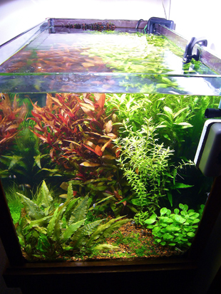 Le misure sono lunghezza 85cm, profondità 45cm, altezza 50cm. Il volume netto dovrebbe aggirarsi sui 160 litri. Siamo venuti ad abitare nell’attuale abitazione nel 2005 e quell’angolo di casa era sin dall’inizio destinato all’acquario…che è arrivato qualche anno dopo. La pazienza è la virtù dei forti! Detto questo ho iniziato ad acquistare i vari accessori con calma, man mano che mi si presentava l’occasione, anche per fare un buon affare, spesso acquistando di seconda mano. Cronologicamente, ho iniziato con il cavetto riscaldante sotto sabbia Dennerle a bassa tensione (24 volt), seguito poi dal riduttore di pressione sempre Dennerle a due manometri. Intanto un amico mi procurava due estintori a CO2 da 3Kg. È stata poi la volta della plafoniera, rigorosamente con lampada ad alogenuri metallici, filtro esterno della JBL “Cristal Profi E 901” e diffusore di CO2 anch’esso rigorosamente esterno della Sera “Reactor 500”, elettrovalvola CO2 della Ruwa. Infine ho acquistato una pompa esterna per poter far lavorare il reattore della Sera, trattasi di una Maxi Jet 1000. • Fondo e protocollo di concimazione Penso che la decisione sul fondo da adottare è stata quella che più di ogni altra cosa mi ha fatto tribolare. Più leggevo sul web, forum e quant’altro, più mi confondevo le idee. Però la voce univoca circa le qualità della Flourite prodotta dalla Seachem mi ha spinto ad usarla quasi come substrato unico. Ho aggiunto un po’ di torba solo nel primo strato comprendente 1/3 ca della Flourite totale, perché ritengo che l’unica cosa che manca a questo substrato è la sostanza organica, indispensabile per le piante. Ho utilizzato 3 sacchi di Flourite e tre piccole confezioni di torba granulare di circa 200gr l’una. Quindi nel primo strato ho usato un sacco di Flourite e le tre confezioni di torba, il tutto ricoperto dagli altri due sacchi di Flourite. Riguardo alla concimazione mi sono affidato sempre alla Seachem per gli stessi motivi che mi hanno spinto ad usare la Flourite e devo dire di essere molto soddisfatto di come procede il tutto sia per stabilità dei parametri chimici che per crescita delle piante: il mio unico problema è lo sfoltimento settimanale che devo operare per l’eccessiva crescita di H. polysperma e di H. zosterifolia. Uso il protocollo base e aggiungo solo “al bisogno” un po’ di fosforo e azoto sempre Seachem. Nient’altro…si fa per dire! • Luce e flora Per le piante mi sono fatto un mio progetto di layout, prediligendo piante non troppo esigenti ma di impatto visivo. La mia filosofia è quella che sono le piante a doversi adattare al mio acquario e non il contrario. Con questo voglio dire che partendo da un progetto iniziale, alcune piante sono deperite ed altre prosperate. Pertanto quest’ultime sono rimaste e le altre rimpiazzate fino a trovare essenze adatte al mio ambiente subacqueo. Ad es. come pianta da “prato”, la Liaeopsis brasiliensis è andata man mano a svigorirsi fino a morire del tutto, mentre rispondeva bene fino a diventare splendida l’Hemianthus callitrichoides. Stessa infausta sorte ha subito la Rotala wallichii, mentre la Rotala rotundifolia ha dimostrato di crescere bene. Ho inserito l’Hygrophila polysperma come pianta predominante da sfondo, insieme all’ heteranthera zosterifolia, entrambe a crescita rapida. Dalle foto è possibile vedere com’è evoluta la crescita e la trasformazione della flora. Tutto ciò anche per andare incontro ad un discorso di gestione “sostenibile”, economicamente parlando, nel senso che ho preferito ad es. usare una lampada da 70 W che per molti potrebbe sembrare un po’ pochino anziché una da 150 W. Avrei quindi potuto consumare più energia elettrica e scegliere piante più esigenti in termini di luce, ma ho preferito una gestione meno onerosa in termini di consumi. Inoltre sulla luce si legge molto, ma a mio avviso c’è troppo empirismo su questo argomento.