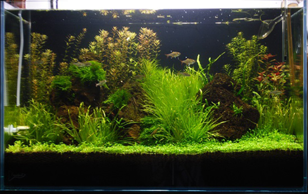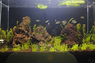 La vasca è stata avviata il 3 aprile 2014: quel giorno tutto era stato pensato per dare adeguate zone d’ombra ai pesci con ADA Horn Wood in vasca, e tantissime varianti di Microsorum, e poco altro. Uno di questi Horn Wood era senza alcun dubbio (a posteriori) falso e non adatto all’acquario, ed è parzialmente marcito rovinandomi quasi il 90% delle Microsorum in vasca.Allora il 6 maggio, parto con il nuovo layout, riusando totalmente il fondo (nemmeno tolto) e ovviamente il filtro già avviato e parte dell’acqua.