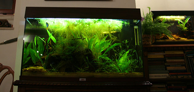 Gli ospiti principali della vasca sono una coppia di Apistogramma agassizi “Double red”; devo dire che sono rimasto affascinato da questi splendidi Ciclidi, dal loro comportamento, e dalla loro bellezza unica; sono una coppia abbastanza affiatata e da Maggio si sono riprodotti una volta e poi si sono fermati, penso a causa delle temperature troppo alte dell’estate; per tutto il tempo che li ho ospitati non hanno manifestato un’eccessiva aggressività tranne che nel periodo di riproduzione, che comunque si è limitata a qualche morso e inseguimento. Inoltre nell’acquario ci sono una decina di avannotti della covata di giugno, ormai hanno raggiunto i 2 cm e si incominciano a intravedere i primi segni distintivi della specie come la colorazione e la banda nera orizzontale che corre lungo tutto il corpo; i genitori ancora non gli badano molto ma sono convinto che fra poco dovrò spostarli in una vaschetta da 20 litri che tengo per le emergenze, anche per favorire ulteriori covate; ho nutrito i piccoli con naupli di Artemia per il primo mese e mezzo poi ho cominciato a svezzarli con mangime secco sbriciolato e congelato (che veniva lasciato sul fondo dai genitori intenti a mangiare i bocconi più sostanziosi). Nella vasca sono altresì ospitati un gruppetto di 7 Otocinclus Vittatus che passano l’intera giornata a brucare sugli arredi e sui vetri; ho notato che sono un po’ difficili nell’alimentazione e non considerano quasi per niente le tabs a base di spirulina e altri alimenti specifici, l’unica cosa che gradiscono è la verdura fresca sbollentata come rondelle di zucchine o foglie di rucola. Nella vasca sono presenti anche gasteropodi come le Melanoides tubercolata, che svolgono un’importante azione di movimento del fondo sabbioso, e delle Physa marmorata arrivate con le piante.