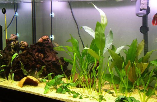 Come fondo utilizzo una sabbia fine a ph neutro di colore ambrato, 3 radici di mangrovie e due semivasi di terracotta.