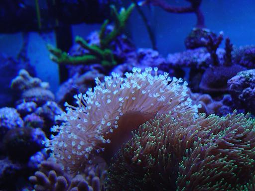 Per quanto riguarda l’illuminazione inizialmente ero partito con una plafoniera di 2 PL da 55 watt l’uno, poi sono passato ad una plafoniera di 4 neon T5 ed infine ho optato per una illuminazione di 6 neon T5 da 24 watt: 2 aquablu spezial + 2 aquablu blus + 2 aqualight da 10000k°.Tramite dei timer regolo gli orari d’accensione dei neon in modo da simulare l’alba e il tramonto per un fotoperiodo totale di 10 ore di luce (dalle 12 alle 22).Per quanto riguarda la fase lunare con un po di fai da te sono riuscito ad inserire dentro la plafoniera una lastra di di 20 led blu che in base alla tensione fornita vengono attivati 1 o piu led.
