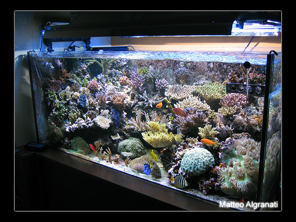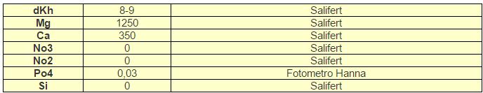 Manutenzione Ormai dopo 3 anni la vasca è abbastanza matura da non aver bisogno di molta manutenzione ed è anche per quello che sono in procinto di rifarla… troppo poco lavoro… non mi diverto più. Cambio acqua, 10% ogni 20 giorni circa… questa è l’unica manutenzione che faccio con cadenza fissa, poi ovviamente c’è la pulizia di pompe, schiumatoio, vetri ma veramente senza fretta e senza sbattimenti strani. Valori dell’acqua