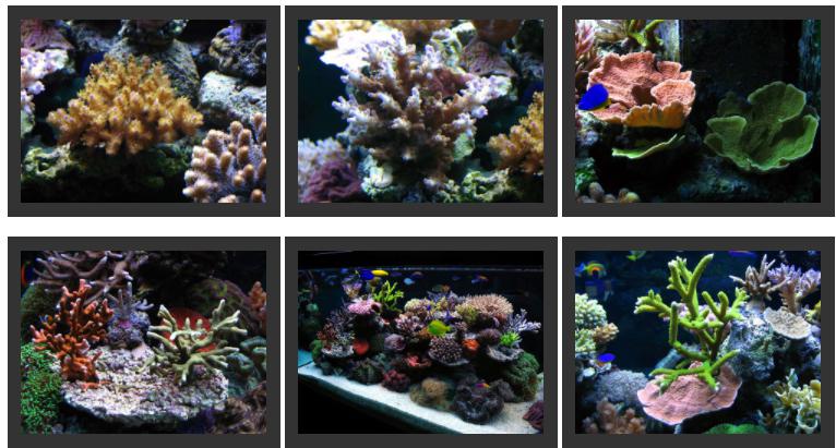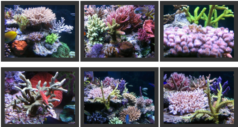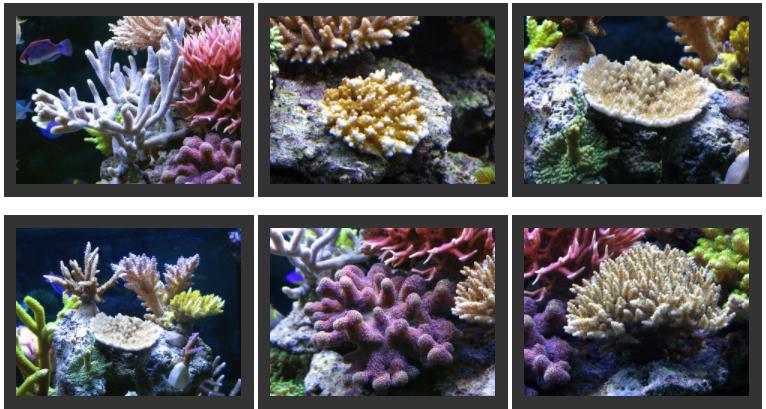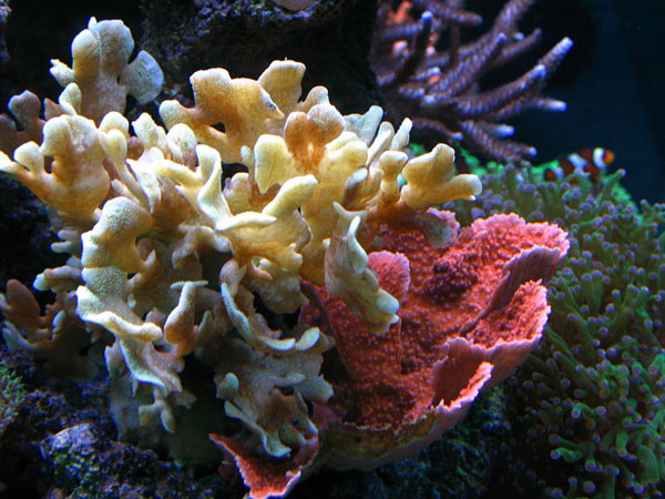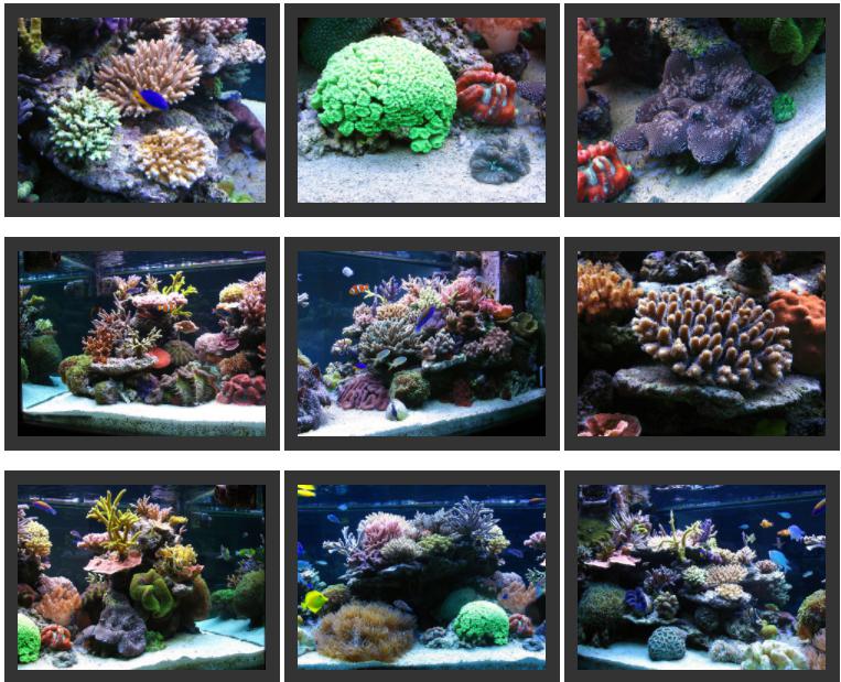 Ci sono più di 100 coralli di cui circa 70 sps tra Acropore selvatiche e talee di Montipore, Millepore, A. tenuis, A. nobilis, A. loisette, Pocillopore, Stilopore, Seriatopore e circa 40 lps tra Euphilie, Trachiphilie, Welsophilie, Sinphilie, Catalaphilie, Tridacne, Blastomussa, Lobophilie, Phisogire, Cinarina lacrimalis, Scolimie etc. etc. Manutenzione