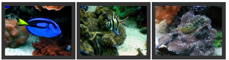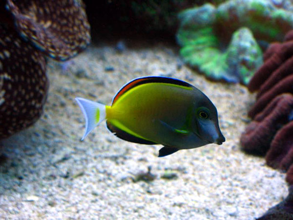 In vasca ci sono una 50 di pesci: Naso litoratus, Paracanthurus hepatus, Zebrasoma flavescens e veliferum, Acanthurus japonicus, Ctenochaetus strigosus, Centropyge acantops, Pseudocromis paccagnella, Gramma loreto, 10 Pseudoanthias luzonensis, Pterapagon kauderni, 6 Cirrilabrus, Parachelinus filamentosus, Halichoeres crhisus, Labroides diminiatus, Salarias fasciatus, 5 Amphiprion ocellaris, Amphiprion perideraion, 4 Chromis viridis, 5 Crisiptera hemicyanea, 2 Neocirrithes armatus, Oxycirrithes typus.