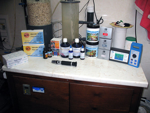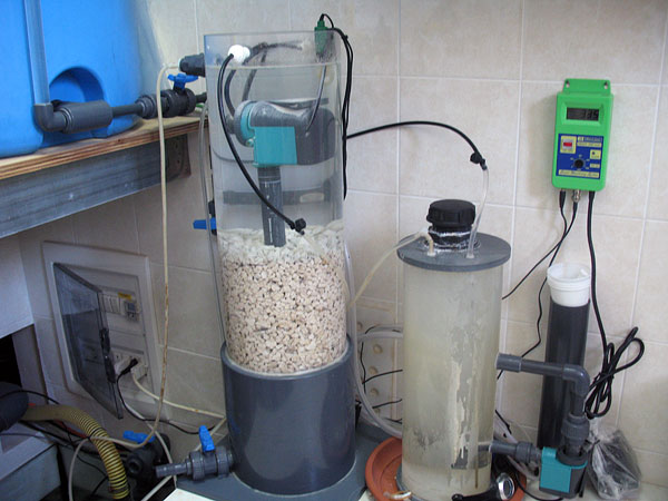 Per la somministrazione del calcio utilizzo un reattore aperto autocostruito alto 70cm diametro 20cm caricato con 15kg di ARM grana grossa, sono molto soddisfatto della resa poiché riesce a mantenere stabili i valori di calcio, kh e magnesio, il reattore è collegato ad una bombola da 10kg di CO2 tramite un riduttore di pressione ed una elettrovalvola Ruwall con sonda del pH Hanna Instrument professionale, il tutto comandato dal sistema Siemens che controlla tutta la vasca. Ho appena acquistato un reattore chiuso bay pomax di 90cm per 20cm da provare appena si esaurisce l”ARM. Buffer utilizzati per calcio, kh sono Prolab Marine. Altri accessori