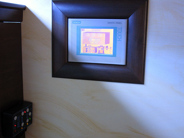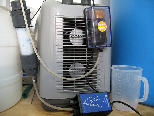 La vasca è gestita tramite un sistema plc con un pannello di controllo touch-screen della Siemens che gestisce alba, tramonto, schiumatoio, ozono, ventole tangenziali, refrigeratore Teco tr20, reattore di calcio, densità, temperatura, ed un ups da 1500w per eventuali mancanze di corrente. Per l”acqua di osmosi utilizzo un impianto a 6 stadi da me autocostruito collegato ad un serbatoio di 300lt che alimenta il reattore di kalkwasser, e un galleggiante meccanico in sump per eventuali ripristini di acqua.