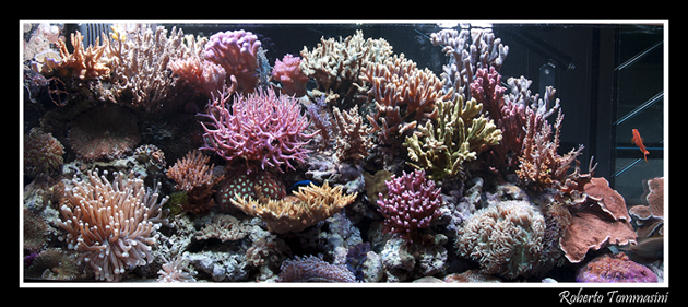 La vasca è popolata in prevalenza da coralli del genere SPS con qualche inserimento di LPS. Volontariamente non ho inserito alcun corallo sof ma di fatto mi ritrovo in vasca con due specie di Zoanthus, un ciuffo di Clavularia viridis e dei Rodactis spp, tutti cresciuti in maniera spontanea dalle rocce vive.