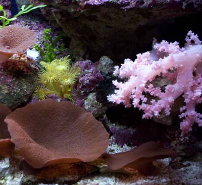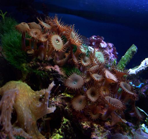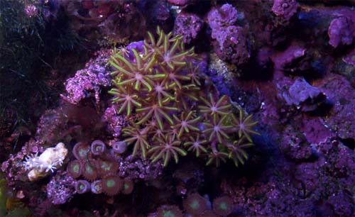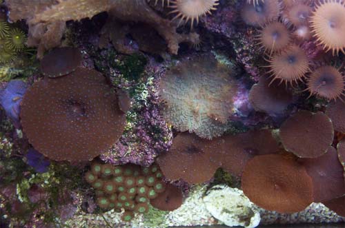 I valori: la salinità dell’acqua è stata sempre mantenuta a 1023 (misurata con Sea-Test Aquarium Systems), pH 8,3, KH intorno a 10°dKH, Ca piuttosto alto, intorno ai 500 mg/l, NO2, NO3 e PO4 assenti o a valori minimi (risultati da test a reagente liquido Sera ed Elos) C’è da dire che queste scelte di gestione abbastanza “essenziali” sono state dettate dalla volontà di allevare esclusivamente coralli “facili”, sicuramente animali più esigenti non avrebbero reagito in maniera così positiva. Gli ospiti introdotti: mi hanno impressionato soprattutto gli actinodiscus che si sono adattati benissimo alle condizioni generali della vasca, moltiplicandosi a vista d’occhio e (come si vede dalle foto) occupando buona parte delle rocce. Oltre a questi hanno popolato la mia vasca Rhodactis, Xenia pumping, Sarcophyton, Palythoa, Protopalythoa, Zoanthus, Parazoanthus, Clavularia, Pachiclavularia violacea, Briareum, Sinularia, Porites, spugne varie (gialle, verdi, arancioni, marroni) una Dendronephthya , che pur essendosi adattata bene alle condizioni della vasca non consiglio di acquistare per le particolari esigenze (purtroppo ignorate anche da me al momento dell’acquisto), più altri invertebrati di cui ignoro la classificazione. Oltre ai coralli ho introdotto della Caulerpa serrulata, una lumaca turbo e un piccolo gamberetto (precisamente Stenopus zanzibaricus).