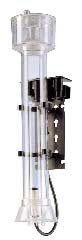 Un altro schiumatoio che si installa esternamente ma non è un vero e proprio nedle weel (l’aria è aspirata ma non è presente la girante a spazzola) è il Cyclon prodotto dall’Acquarium Systems (foto sotto). E’ uno schiumatoio molto economico adatto per piccoli acquari (100-150 litri) che presenta delle caratteristiche interessanti: la colonna è a tripla camera, movimento circolatorio, il bicchiere è progettato con cura e tutta la struttura è realizzata con stampi che ne conferiscono buone finiture. Purtroppo è molto difficoltosa la taratura del flusso e ciò ne compromette il funzionamento e la resa. E’ possibile effettuare alcune modifiche al Cyclon per migliorarne le prestazioni: basta effettuare un foro sul fondo dello schiumatoio ed inserire una porosa in legno nel tubo interno più stretto e aumentare con un tubo di pochi centimetri la distanza tra il bicchiere e la colonna di contatto. Il risultato è un ibrido tra uno schiumatoio ad aspirazione ed uno a diffusore d’aria, sufficientemente efficiente per gestire piccoli acquari con pochi pesci. (Nota: L’acquarium system è uscita con il Cyclon nuova versione, modificata e più efficiente rispetto al modello precedente)