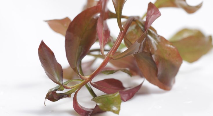 Le foglie hanno una faccia sul verde e l’altra sul rosso; e le tonalità rosse delle sue foglie, lateralmente arrotondate e terminanti con una piccola punta, si accrescono se la presenza del nitrato NO3 (5 mg/l) è bassa, quella dei fosfati è alta (1,5-2 mg/l) e c’è quella del ferro e dei micronutrienti.