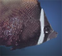 ![]() | Chaetodon colpito da vermi e da una secondaria infezione batterica. |