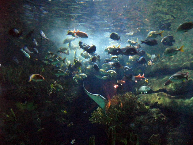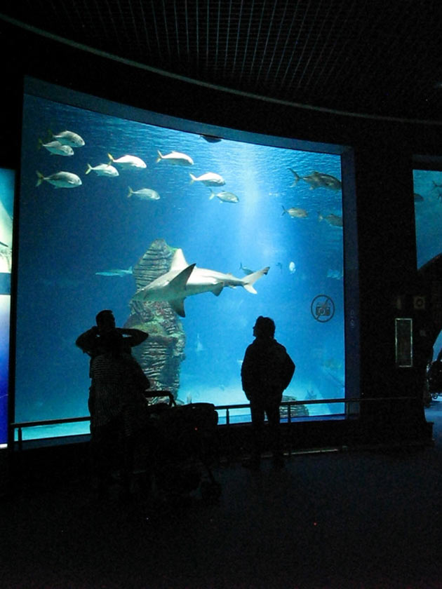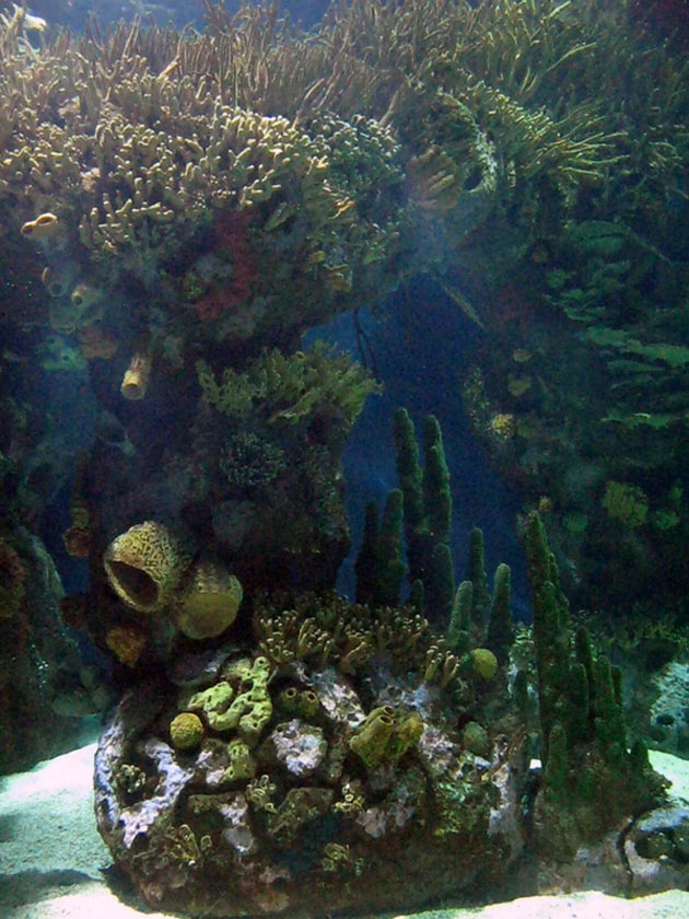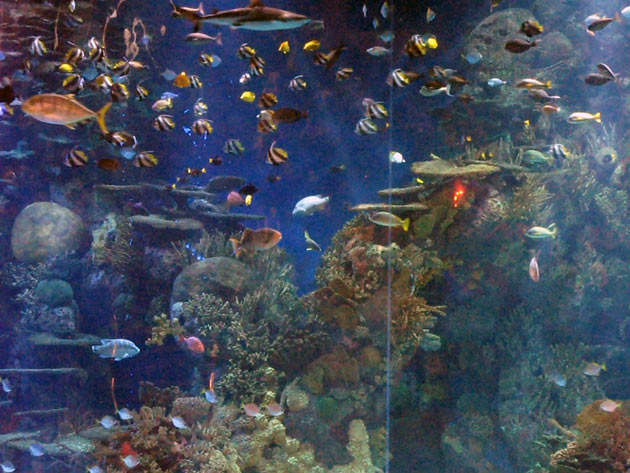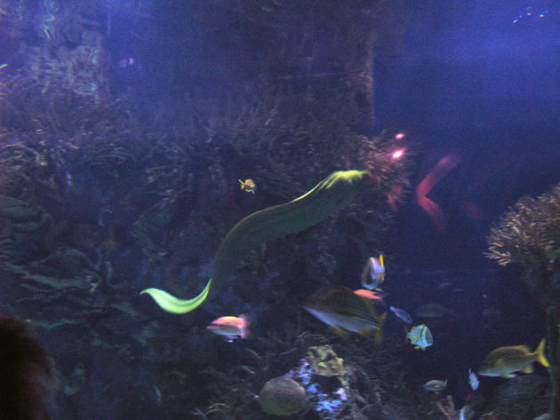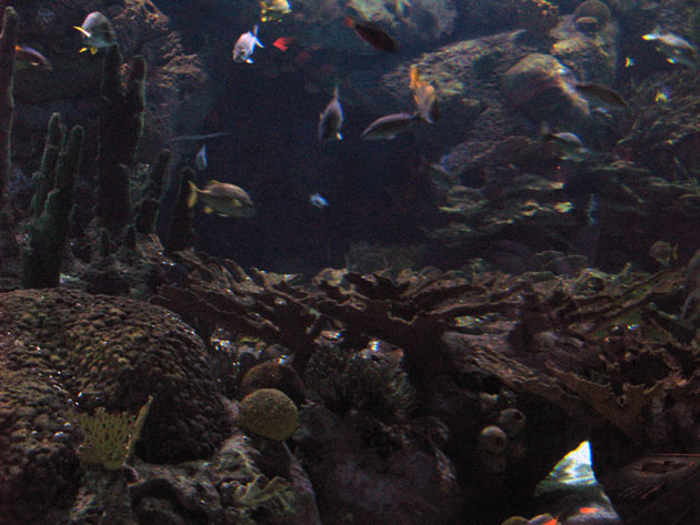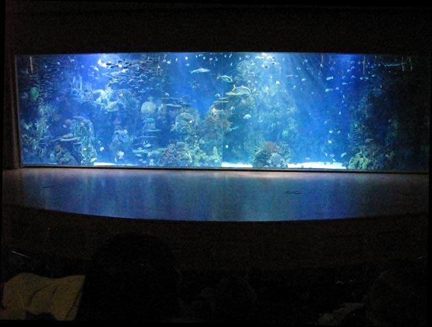 La visita è divisa tra vari ambienti e vasche che rappresentano, raggruppati, i diversi biotopi marini del pianeta. Il primo che si incontra, e quello sul quale avevo i maggiori timori, è quello del biotopo tropicale, le barriere coralline. Si tratta di una unica stanza lunga una trentina di metri che vorrebbe ricordare la forma della carena di una barca dalla quale si possono vedere i fondali. Nei 2 lati lunghi sono alloggiate le 2 vasche “reef” principali lunghe una ventina di metri e alte circa 3, ed in fondo c’è la terza e ultima vasca di circa 5 mt per 2.