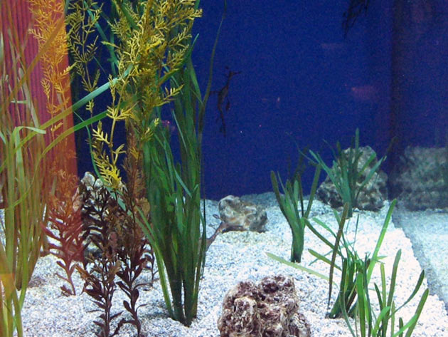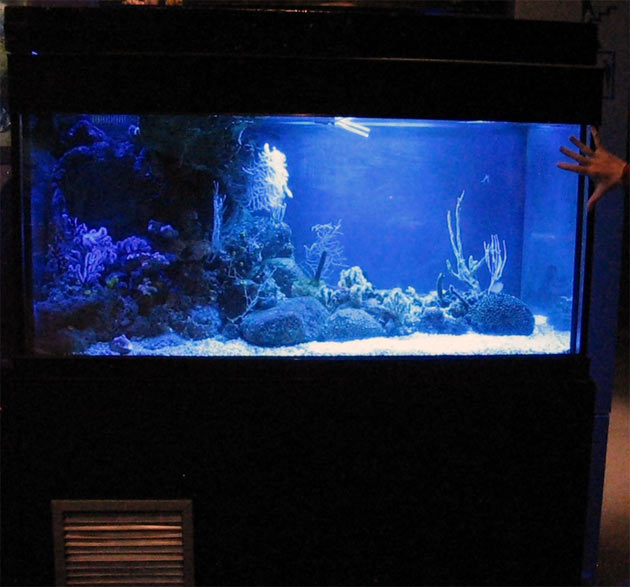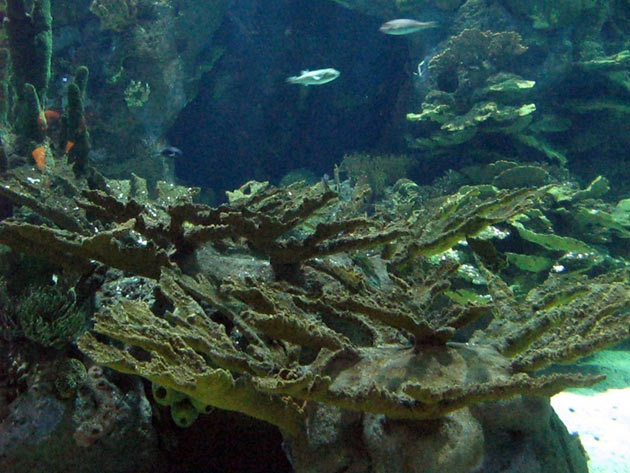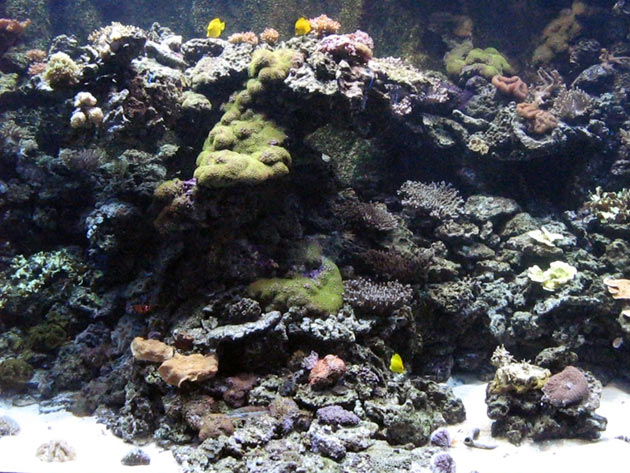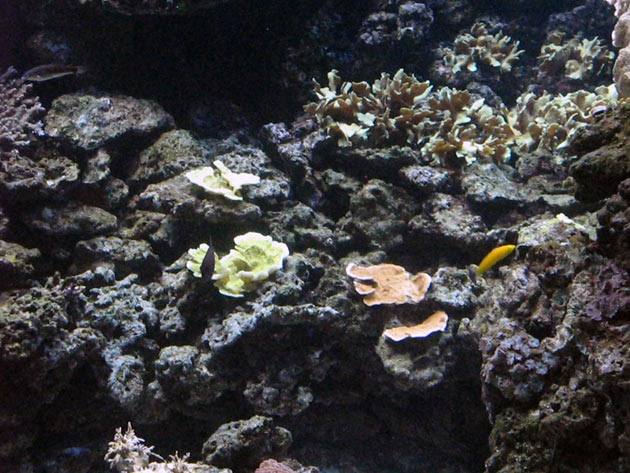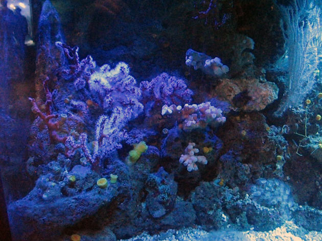 Le due lunghe vasche tropicali, disposte una frontalmente all’altra, sono, almeno apparentemente, in fotocopia e la cosa più deludente, e terzo e ultimo segnale d’allarme, è che tutti i coralli all’interno sono finti: il colore dominate è un grigio spento molto triste. Il livello stesso dell’illuminazione è talmente basso che non permetterebbe certo a coralli SPS di sopravvivere e tanto meno di colorarsi.