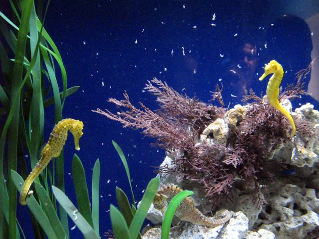 A fianco di questa, una vasca con dei bellissimi cavallucci marini del genere Sea dragon e un’altra con cavallucci di tipo più comune (forse dei Reidi). In entrambe le vasche l’ormai abituale flora plastificata.