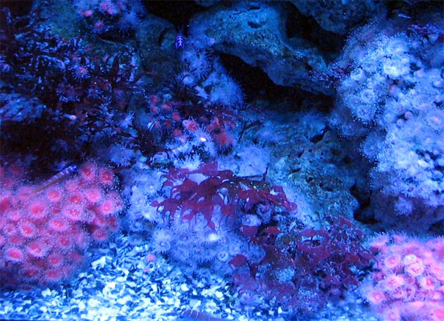 La terza vasca di questo biotopo, consentitemi le virgolette,“tropicale”, la più piccola delle 3, in realtà qualche corallo vivo tenta di allevarlo, ma si limita a veramente ben poca cosa e anche di estrema facilità e con risultati che non soddisfacerebbero nemmeno un acquariofilo di scarse pretese. Pochi LPS e qualche sparuta Montipora foliosa sono gli unici punti di colore che si discostano dal grigio/marrone che predomina la visione complessiva.