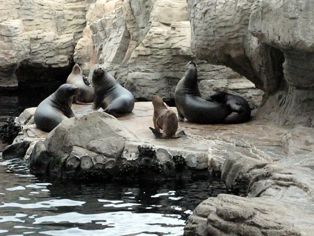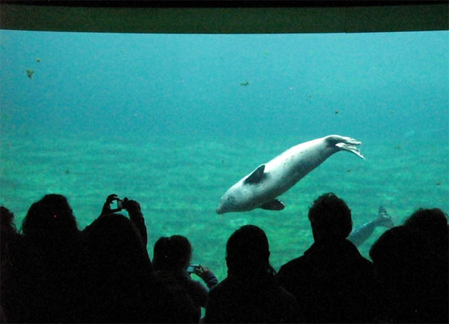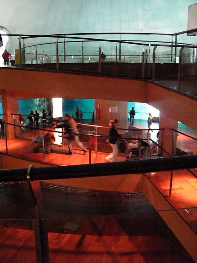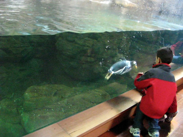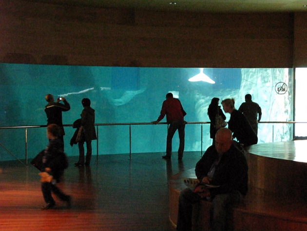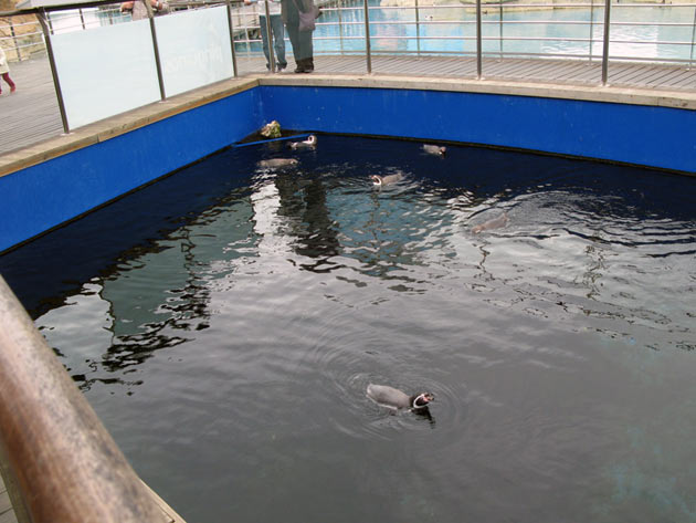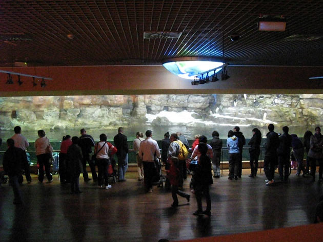 La prima di queste è quella dedicata ai pinguini, alla quale si ha accesso fino a toccare la parete in acrilico della vasca; purtroppo non essendo impedito il contatto con la parete della vasca e quindi è un continuo correre avanti e indietro di bambini e di battere di mani e di oggetti vari sulla vasca stessa I poveri pennuti, sottoposti a questo trattamento per 15 ore al giorno, mi sono sembrati abbastanza esauriti.