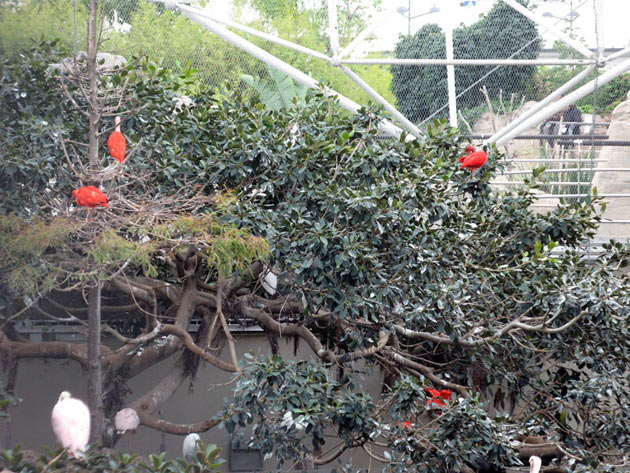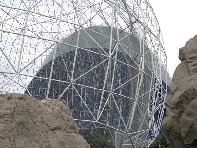 Passando dall’esterno dopo un breve tragitto, si incontra una voliera a forma sferica realizzata in tubi d’acciaio con una rete di protezione su tutta la sua superficie nella quale vi sono ospitati diverse specie di uccelli e piante tipiche delle zone umide temperate del pianeta. All’ingresso vi era una lunga coda per l’accesso all’interno, ma la si può comodamente vedere dall’esterno senza entrarvi dato che è completamente circondata da un vialetto percorribile a piedi.